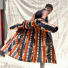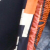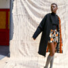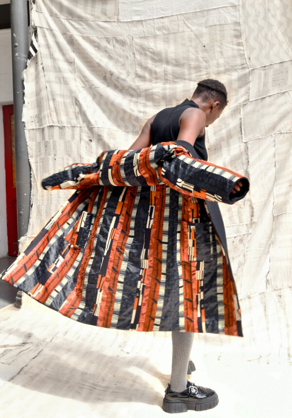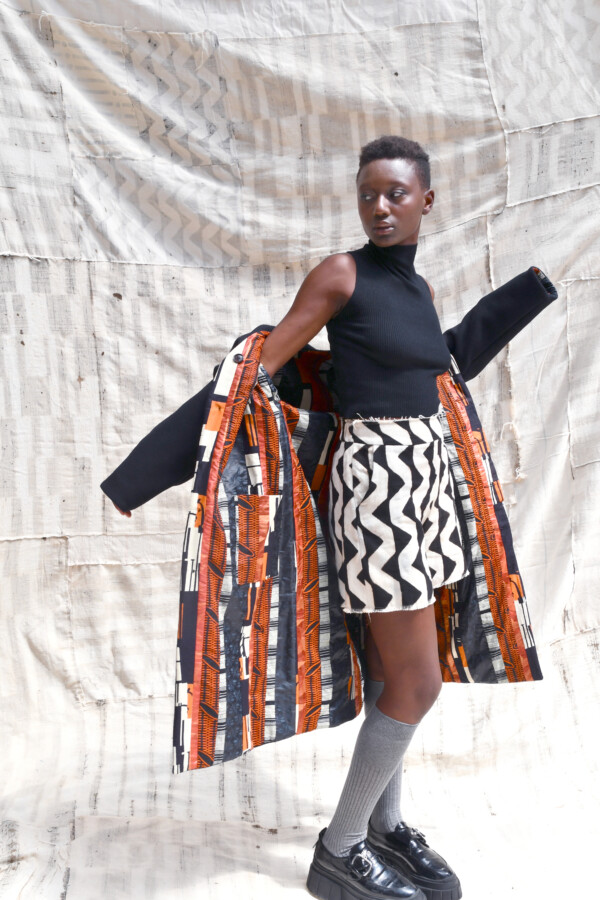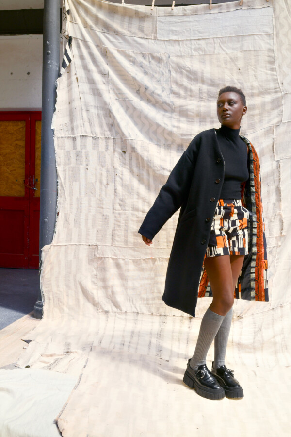 Cappotto a kimono reversibile realizzato con lana Manteco della linea ReviWool® e mosaico di cotone wax africano e BemBAZIN™ dell’azienda Brunello. Il mosaico è stato realizzato alternando strisce di wax e BemBAZIN™, citando un’estetica della tradizione in West Africa. Il cappotto è dotato di chiusura con bottoni vintage. Può essere indossato da entrambi i lati, dal lato in lana avrà le  tasche a filetto, dal lato in mosaico di wax et bazin tasche a toppa.