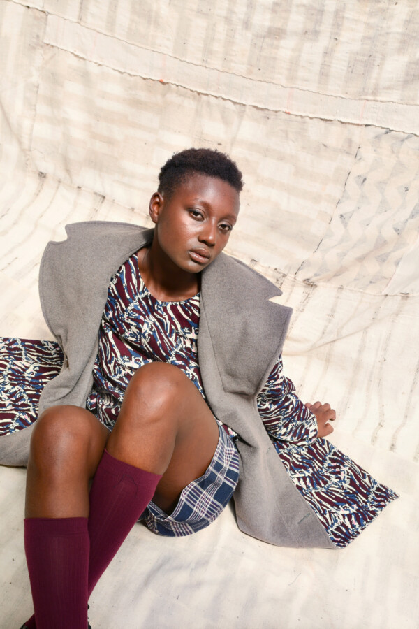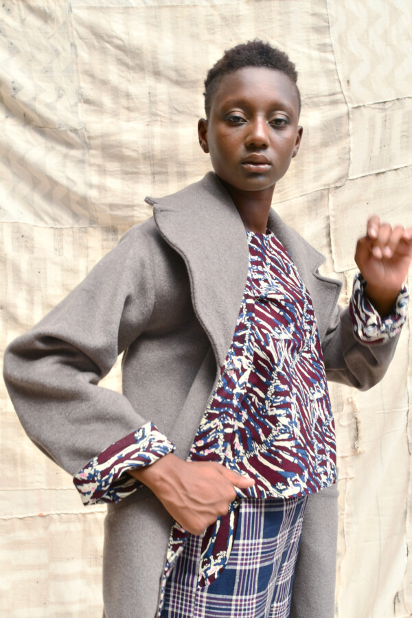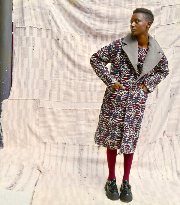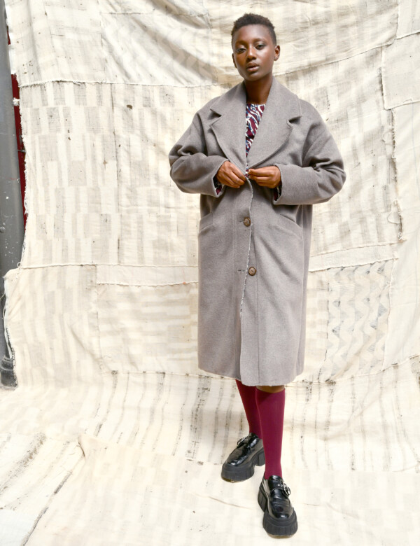 Cappotto reversibile realizzato con lana Manteco della linea ReviWool® e cotone wax africano. Il cappotto è dotato di revers ampio e chiusura con bottoni vintage, tasche con filettone dal lato in lana e tasche a toppa dal lato in wax. Può essere indossato da entrambi i lati, dal lato in wax avrà il revers a contrasto in lana.