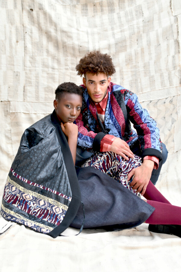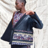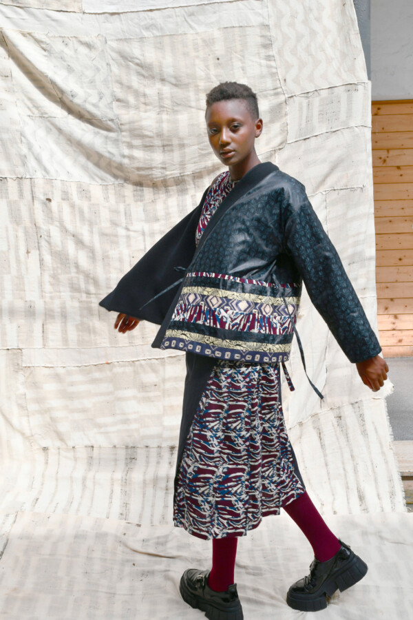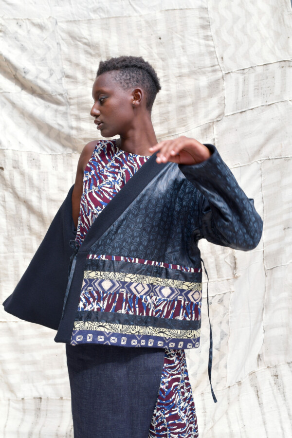 Giacca kimono a portafoglio reversibile realizzato con lana Manteco della linea ReviWool® e mosaico di tessuti africani wax e BemBAZIN™ prodotto da Brunello in Italia. Manica lunga e chiusura con lacci, la giacca può essere indossata sia dal lato in lana, che dal lato in mosaico di BemBAZIN™ e wax.