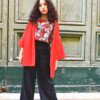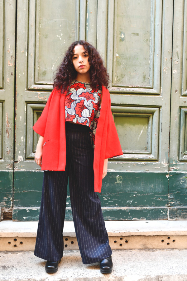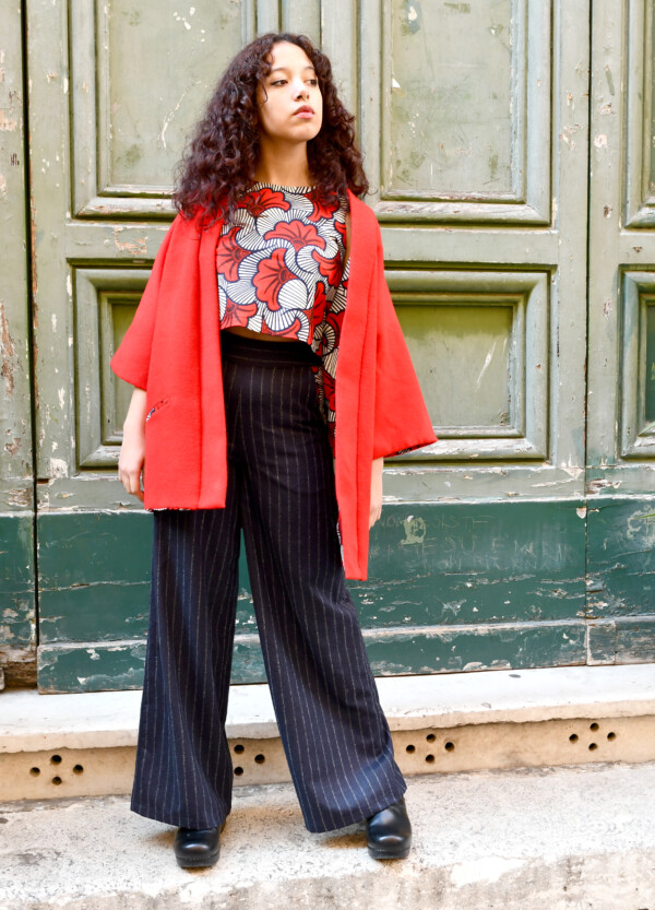 Pantalone a palazzo in lana di recupero da dead stock con tasche a contrasto in cotone wax africano. Cintura con elastico posteriore e cerniera lampo laterale. Taglio ampio a palazzo e vestibilità morbida.